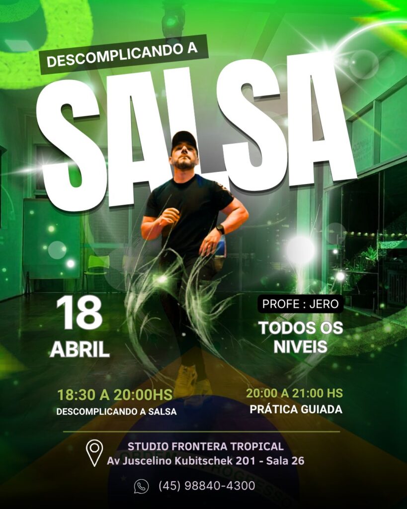 Sábado – 18 de abril 🕡 18h30 — “Descomplicando a Salsa”🕗 20h00 — Prática guiada💰 Investimento:▫️ R$50 antecipado▫️ R$60 na hora▫️ Desconto para alunos regulares📍 Studio Frontera Tropical – Av. Juscelino Kubitschek 201, Sala 26 – Segundo Andar